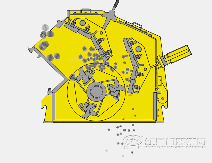 工作時(shí),轉(zhuǎn)子由電動(dòng)機(jī)經(jīng)三角皮帶傳動(dòng)作固定方向旋轉(zhuǎn),在其機(jī)體上面懸掛著一組反擊板,活性石灰由裝料口,經(jīng)進(jìn)料導(dǎo)板落入轉(zhuǎn)子上,被固定在轉(zhuǎn)子上的板錘打擊到反擊板上,再?gòu)姆磽舭迳下湎屡c轉(zhuǎn)子連續(xù)打上去的活性石灰塊互相沖擊,因此活性石灰塊在反擊板、轉(zhuǎn)子、導(dǎo)板、鏈幕之間所形成的破碎腔內(nèi),周而復(fù)始的反復(fù)運(yùn)動(dòng),而產(chǎn)生強(qiáng)烈的沖擊現(xiàn)象,活性石灰塊沿其自然裂縫或凹陷破碎,從排料口排出。